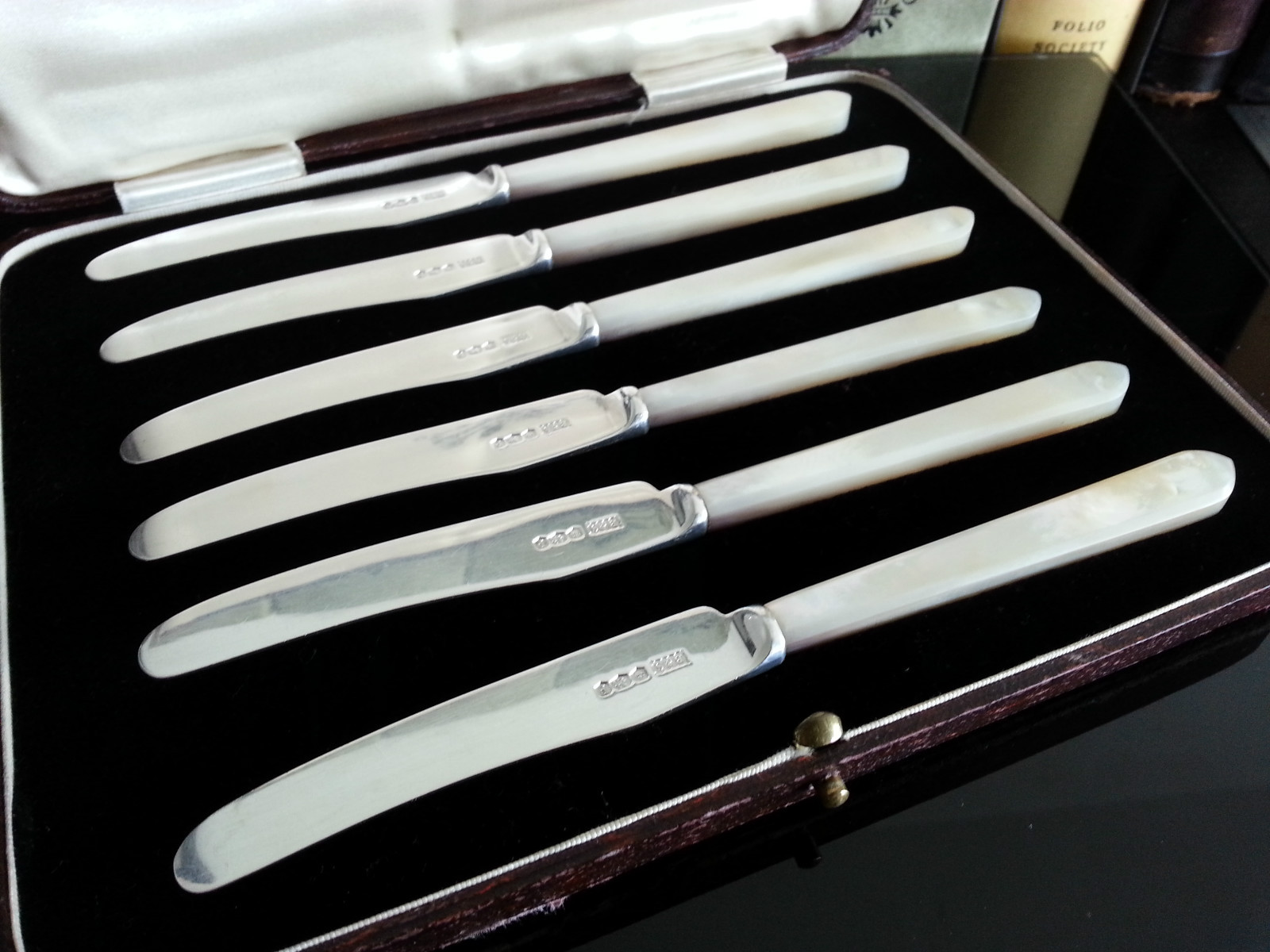 Art Deco c.1932 solid silver & mother of pear handles kitchen table knifes set 6 Posted by Unknown on March 16, 2015 Get link Facebook X Pinterest Email Other Apps Stunning Art Deco c.1932 solid silver & mother of pear handles kitchen table knifes set 6 British solid silver hallmark: Sheffield crown, lion passant, p (c.1932) maker mark: Brook & Son total spoons weight 138.7 g Condition: see photos ( mother of pearl not damage) BUY IT NOW SEE OTHER ITEMS Shipments: UK delivery: Second class Standard Recorded Signed For™ Special delivery Next day International delivery: Standard - Airmail small parcel Signed For - Standard International Signed For™ IS Express delivery - Parcel force Express Comments