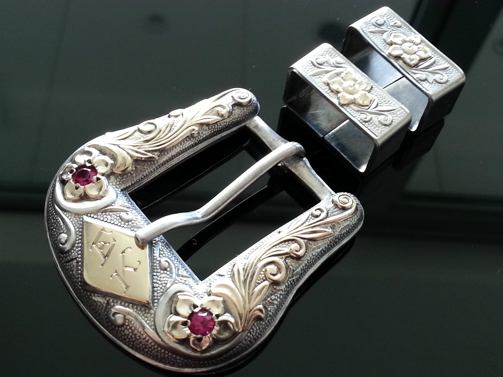 Retro solid silver and 10K gold and ruby stoned buckle with belt keepers